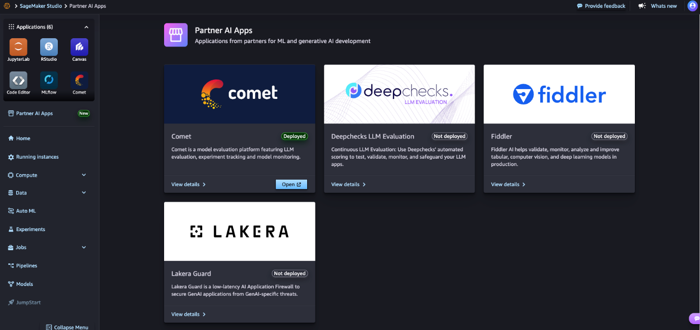 - On the SageMaker AI console, under Applications and IDEs in the navigation pane, choose Partner AI Apps, then choose View details for Comet.