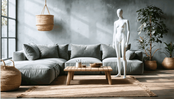 The Search and Recolor and Search and Replace tools target specific elements within images for modification. Search and Recolor changes object colors; for example, showing different colorways of a dress without new photoshoots. In the following illustration, Search and Recolor changes the color swatch on furniture.