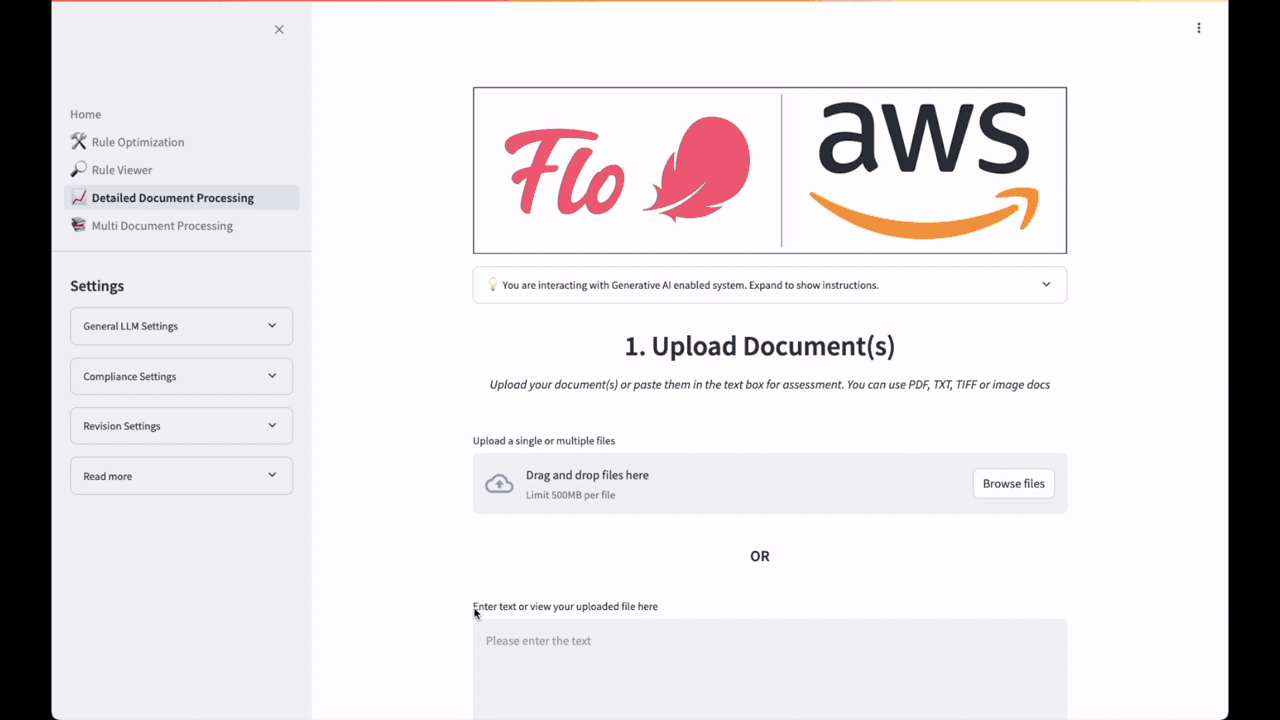 The Content Review and Revision feature operates in two UI modes: Detailed Document Processing and Multi Document Processing, each catering to different scales of content management. The Detailed Document Processing mode offers a granular approach to content assessment and is depicted in Figure 5. Users can upload documents in various formats (PDF, TXT, JSON or paste text directly) and specify the guidelines against which the content should be evaluated.