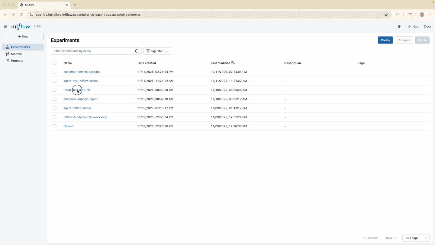 The new MLflow serverless capability in SageMaker AI delivers enterprise-grade management with automatic scaling, default provisioning, seamless version upgrades, simplified AWS Identity and Access Management (IAM) authorization, resource sharing through AWS Resource Access Manager (AWS RAM), and integration with both Amazon SageMaker Pipelines and model customization. The term MLflow Apps replaces the previous MLflow tracking servers terminology, reflecting the simplified, application-focused approach. You can access the new MLflow Apps page in Amazon SageMaker Studio, as shown in the following screenshot.
