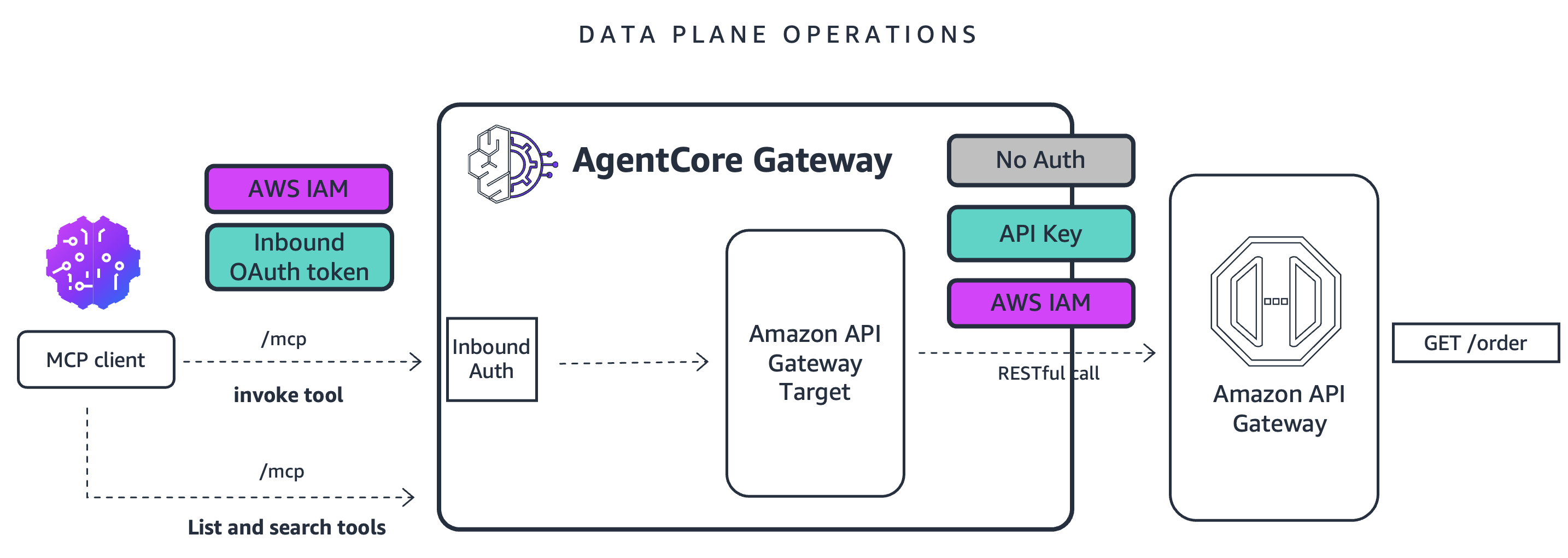 For API Gateway as a target, AgentCore Gateway supports the following types of outbound authorization: