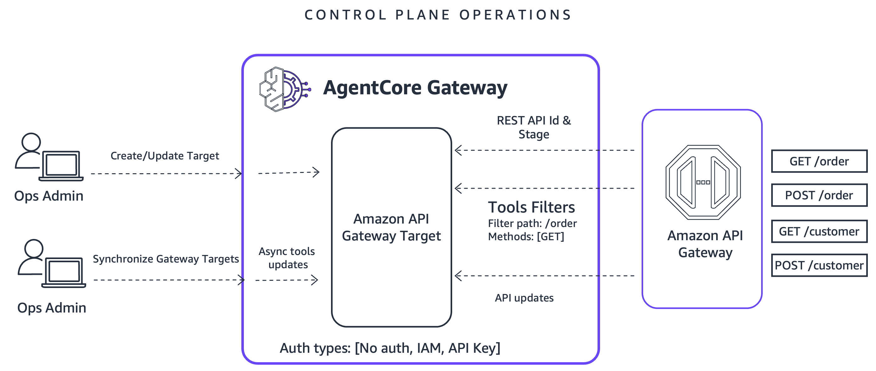 AgentCore Gateway now supports API Gateway targets in addition to existing target types (Lambda functions, OpenAPI schemas, Smithy models, and MCP servers).