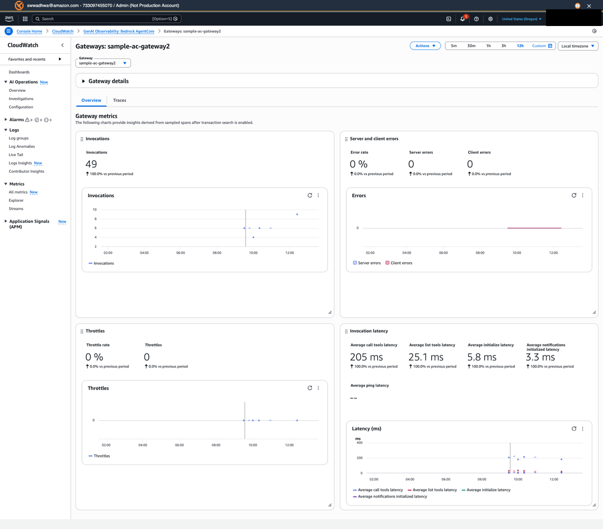 Along with this, AgentCore Gateway offers detailed CloudWatch metrics including the usage metrics (TargetType, IngressAuthType, EgressAuthType, RequestsPerSession), invocation metrics (Invocations, ConcurrentExecutions, Sessions), performance metrics (Latency, Duration, TargetExecutionTime), and error rates (Throttles, SystemErrors, UserErrors).