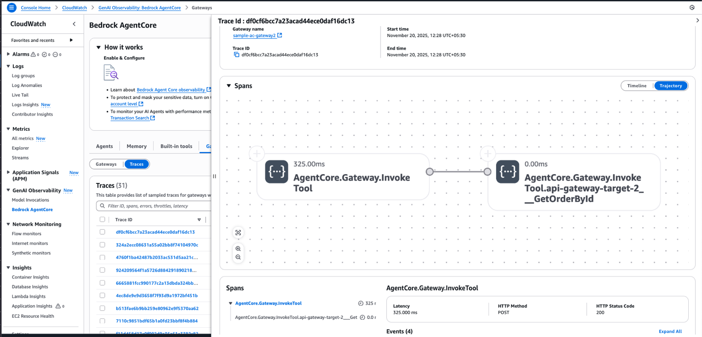AgentCore Gateway also supports AWS X-Ray and OTEL conformant vended spans that customers can use to track invocations across different primitives that are being used.