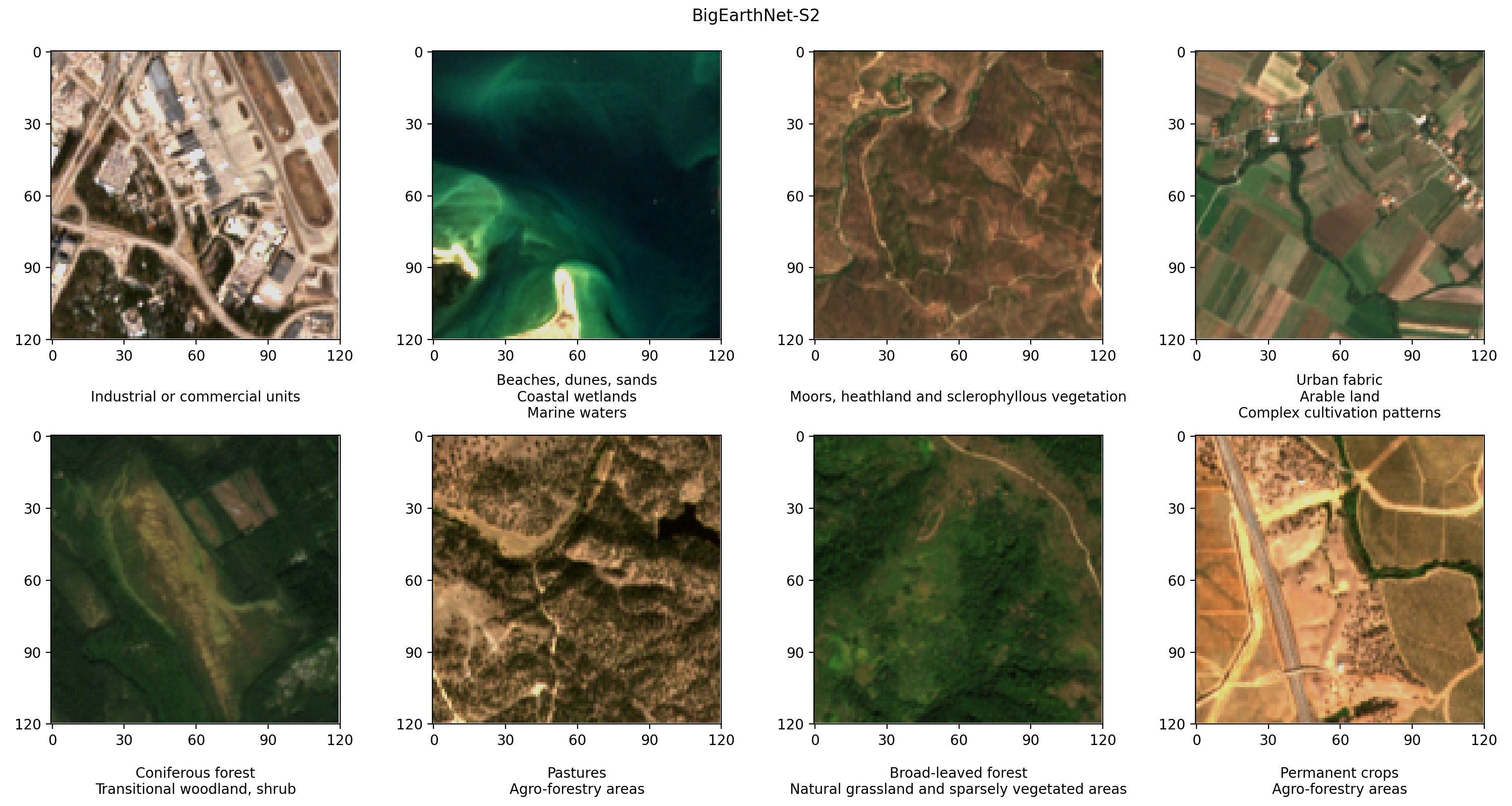 BigEarthNet-S2 is a benchmark archive that contains 590,325 multispectral images collected by the Sentinel-2 satellite. The images document the land cover, or physical surface features, of ten European countries between June 2017 and May 2018. The types of land cover in each image, such as pastures or forests, are annotated according to 19 labels. The following are a few example RGB images and their labels.