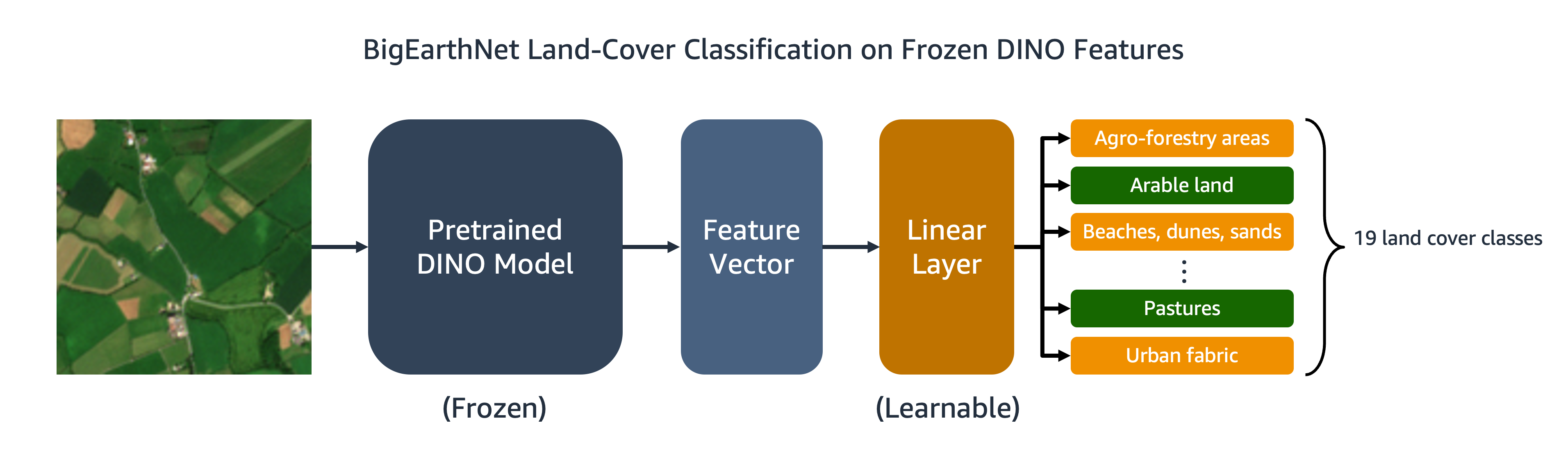 Our trained DINO model can be transferred to downstream tasks like image classification or segmentation. In this section, we use the pre-trained DINO features to predict the land cover classes for images in the BigEarthNet-S2 dataset. As depicted in the following diagram, we train a multi-label linear classifier on top of frozen DINO features. In this example, the input image is associated with arable land and pasture land covers.