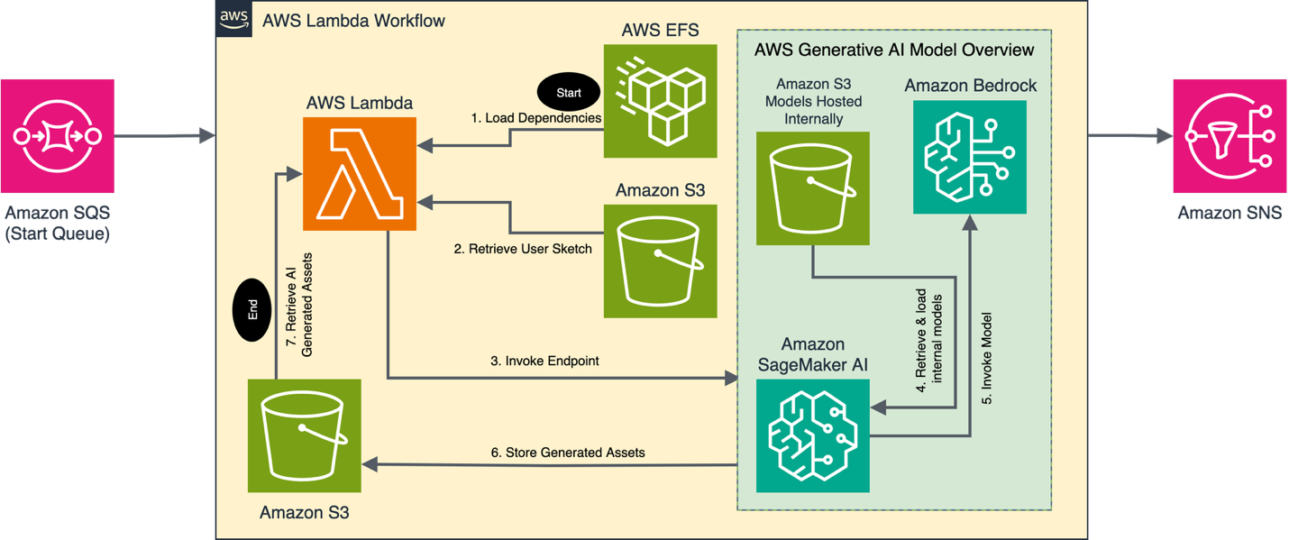 End-to-end AWS Generative AI workflow diagram demonstrating Lambda orchestration with storage, messaging, and AI model integration