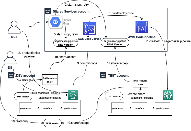 - ML engineers, ML admins, and compliance teams, who manage deployment and operations of those ML workflows from a shared services account, also require visibility into the deployed pipeline in the test account. They might also require additional permissions for starting, stopping, and retrying those ML workflows.
