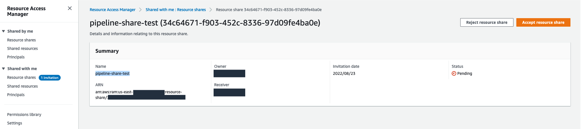 sagemaker-pipelinein the test account, the CI/CD pipeline creates a resource share forsagemaker-pipelinein the test account. - A resource share from the test
