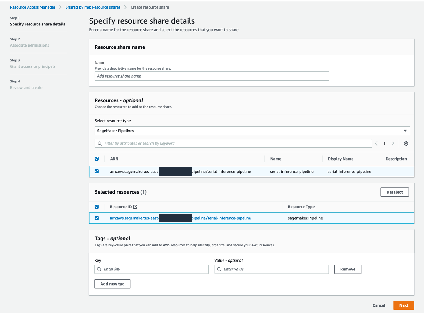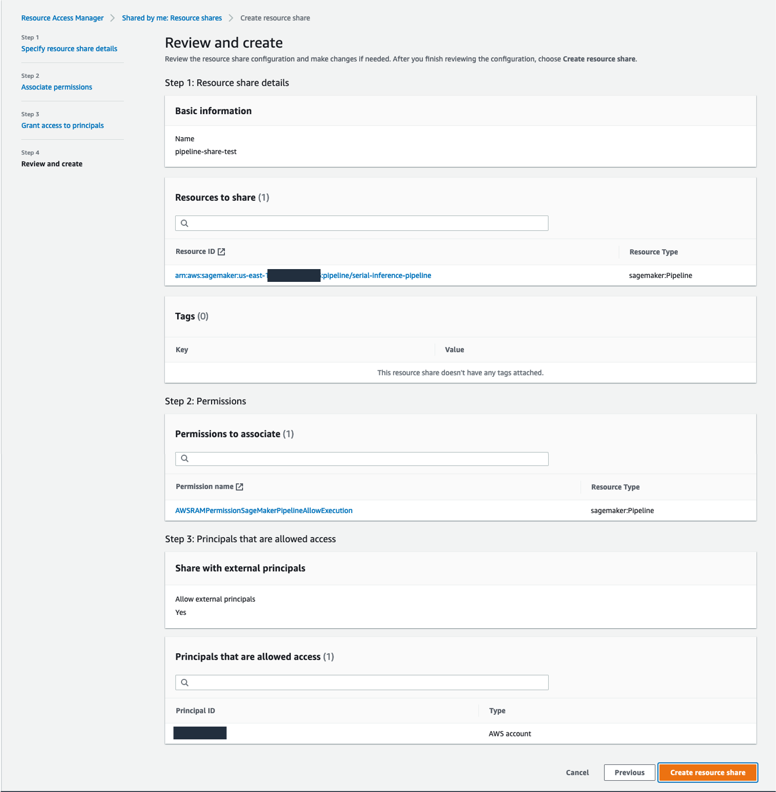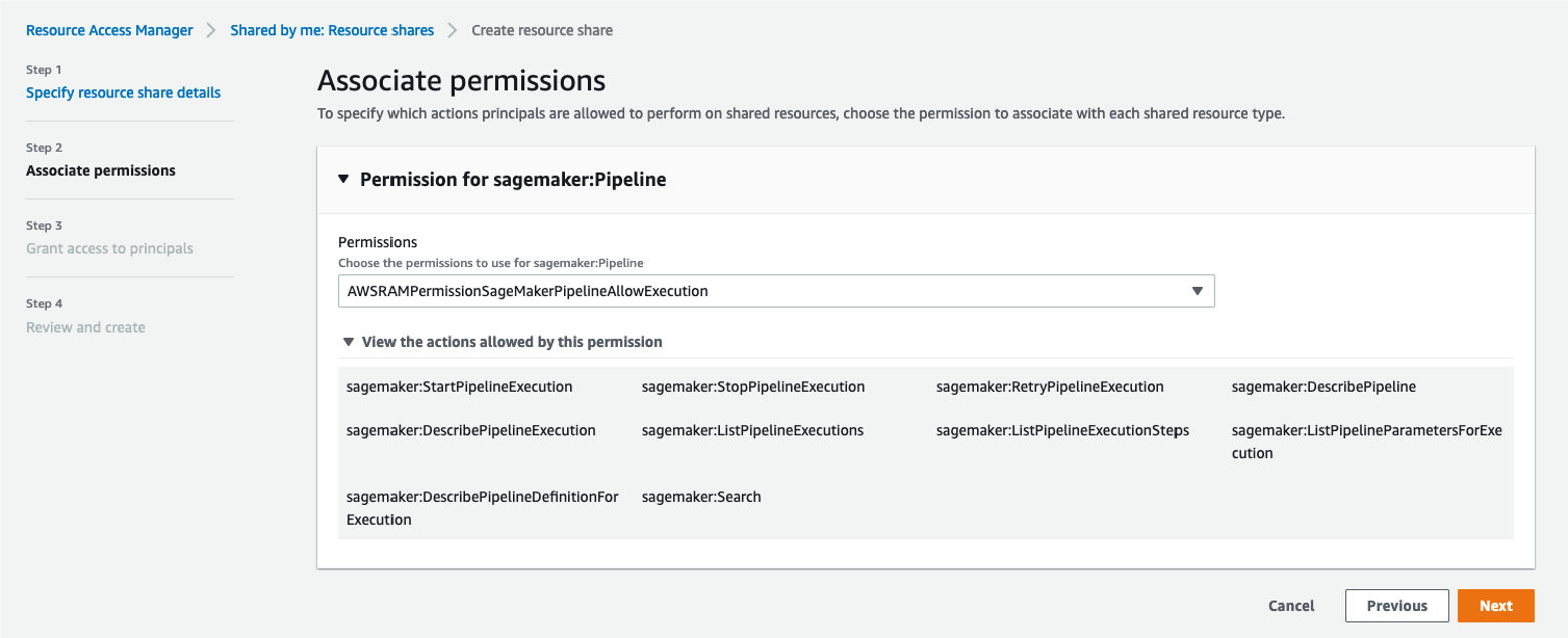 When creating your resource share, you can choose from one of two supported permission policies to associate with the SageMaker pipeline resource type. Both policies grant access to any selected pipeline and all of its runs.