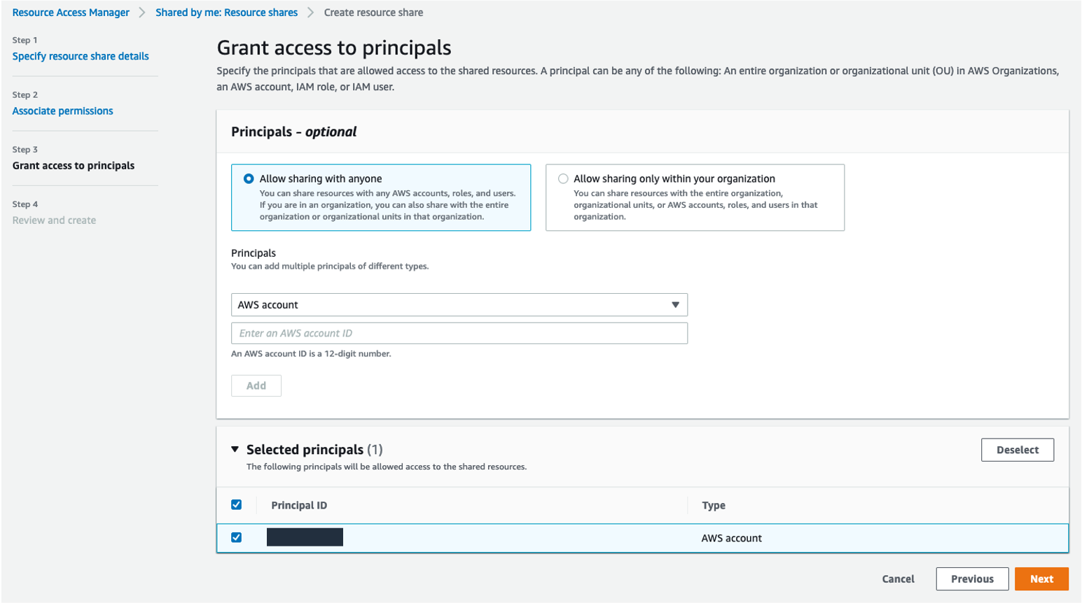 - For Principals, choose your principal type (you can use an AWS account, organization, or organizational unit, based on your sharing requirement). For this post, we share with anyone at the AWS account level.