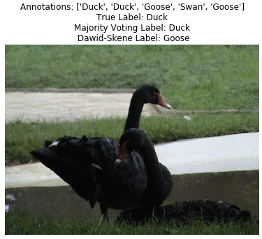 The most straightforward way of generating a labeled dataset is to send each image out to a single worker. However, a dataset where each image is only labeled by a single worker is more likely to be poor quality. Errors can creep in from workers providing low quality labels, stemming from factors like low skill or indifference. Quality can be improved if responses can be elicited from multiple workers and then aggregated in a principled manner. A simple way to aggregate responses from multiple annotators is to use majority voting (MV), which simply outputs the label that receives the most votes, breaking any ties randomly. So, if three workers labeled an image as “owl,” “owl,” and “falcon” respectively, MV would output “owl” as the final label. It can also assign a confidence of 0.67 (=2/3) to this output, since the winning response, “owl” was supplied by 2 out of the 3 workers.