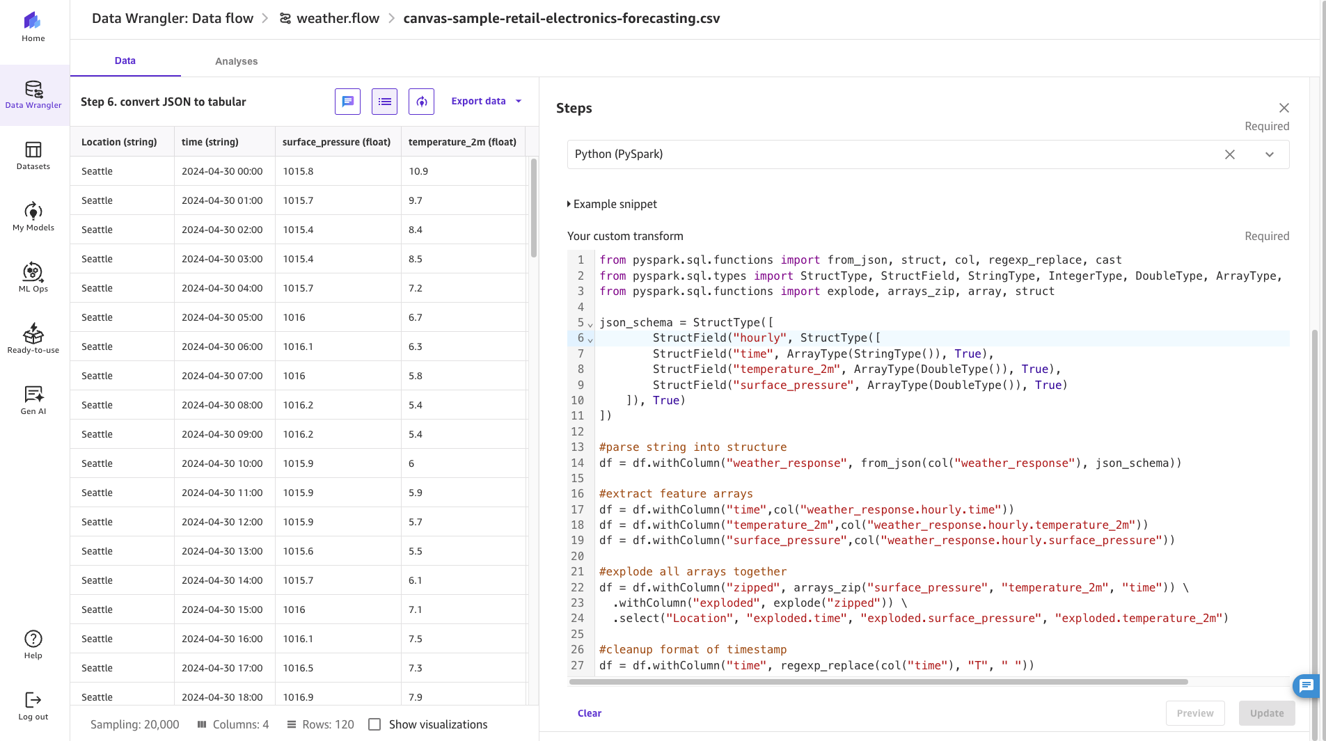 The following code snippet is from the preceding screenshot. This code converts the weather provider nested JSON array into tabular features: