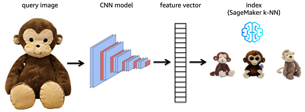 To enable efficient searches for visually similar images, we’ll use the Amazon SageMaker k-Nearest Neighbors (k-NN) algorithm. The main objective of training with the k-NN algorithm is to construct an index. This index enables efficient lookups of items that are “neighbors” as measured by a distance metric such as Euclidean distance or cosine similarity. At lookup time, the index is queried for the k-nearest neighbors of a sample query item. In the context of visual search, a query image is featurized using a modified CNN model, and the resulting feature vector is then used to look up visually similar matches in the k-NN index of reference item feature vectors: