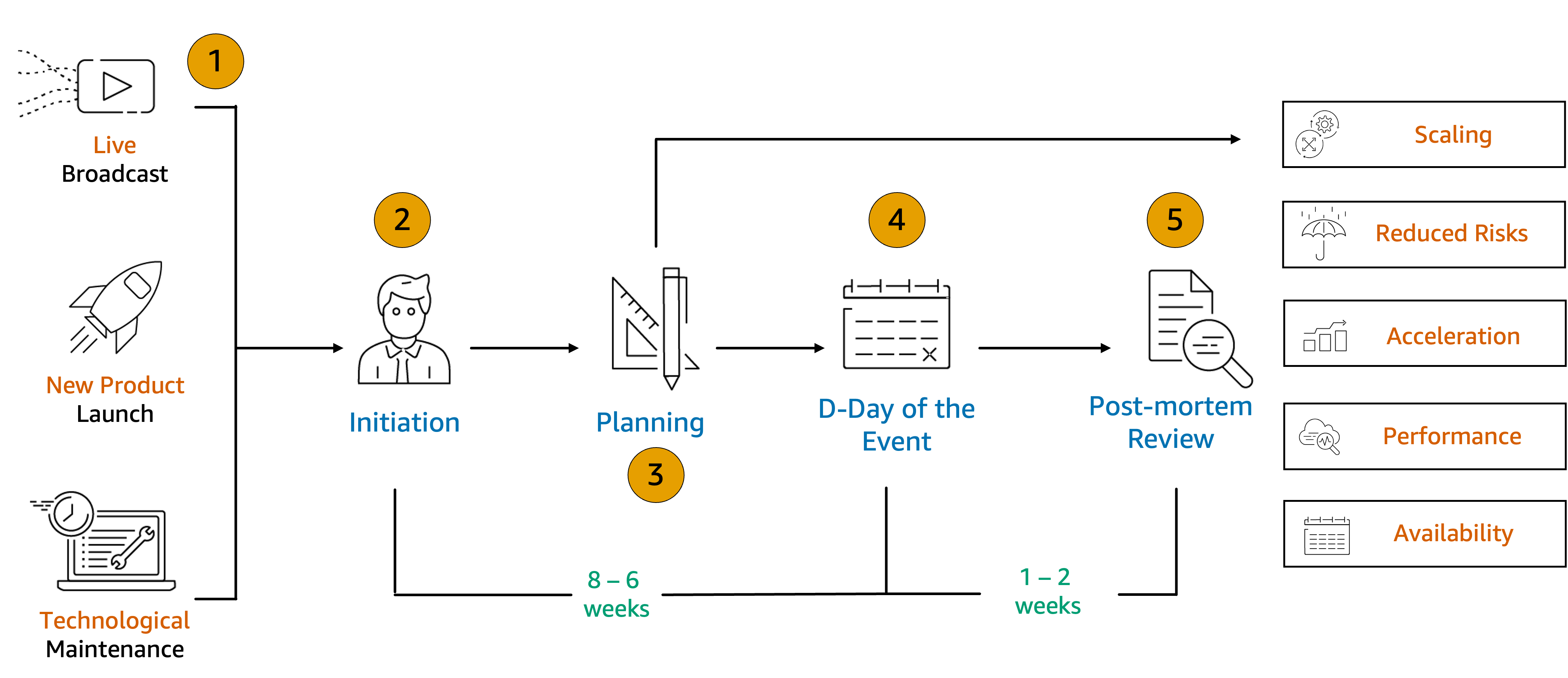 ![AWS Countdown Program's five steps: (1) Large-scale event definition (represented by the Live [Broadcast], New Product [Launch] and Technological [Maintenance]), (2) Initiation, (3) Planning, (4) D-Day of the Event (steps 2-4 have a timeline of 8-6 weeks noted), (5) Post-mortem Review (steps 4-5 have a timeline of 1-2 weeks noted). Timeline: 8-6 weeks preparation. Benefits listed: Scaling, Reduced Risks, Acceleration, Performance, Availability.](https://d2908q01vomqb2.cloudfront.net/fb644351560d8296fe6da332236b1f8d61b2828a/2025/10/27/AWS-countdown.png)
