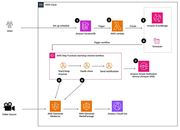 This serverless solution automates AWS Elemental MediaLive channel management with AWS Lambda, Amazon EventBridge, and AWS Step Functions. You control costs by only running channels when needed.
