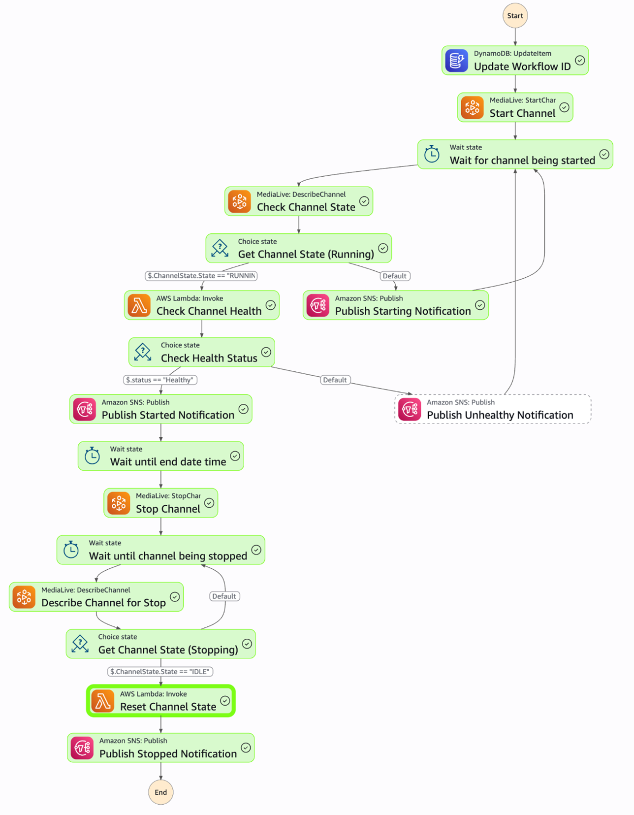 - Starts the AWS Elemental MediaLive channel.