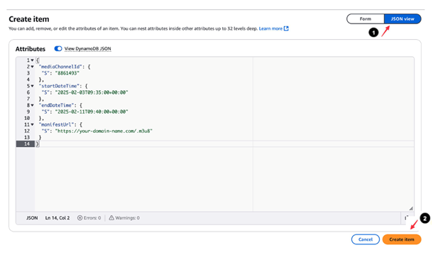 Choose JSON view and confirm that the input values are correct, then choose Create item, as shown in the following screenshot.