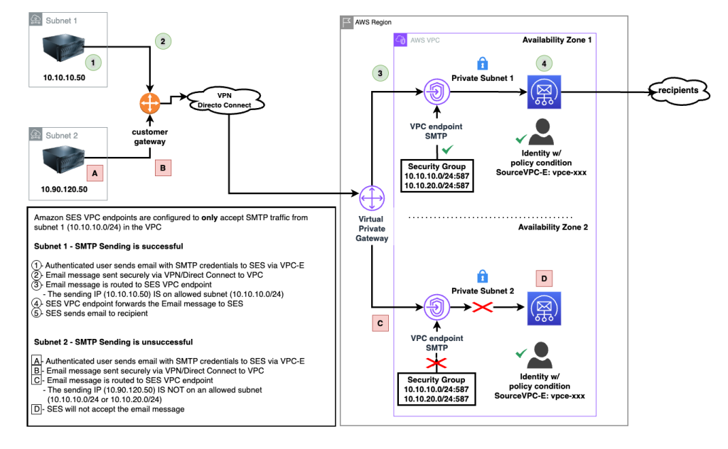 In this post, we discuss and guide you in enhancing your email security by using VPC endpoints with Amazon SES to address critical security challenges faced by organizations sending sensitive communications. The solution demonstrates how to implement network-level controls through VPC endpoints, security groups, and IAM policies to restrict SMTP traffic to authorized networks while maintaining compliance with regulatory frameworks like HIPAA and GDPR.