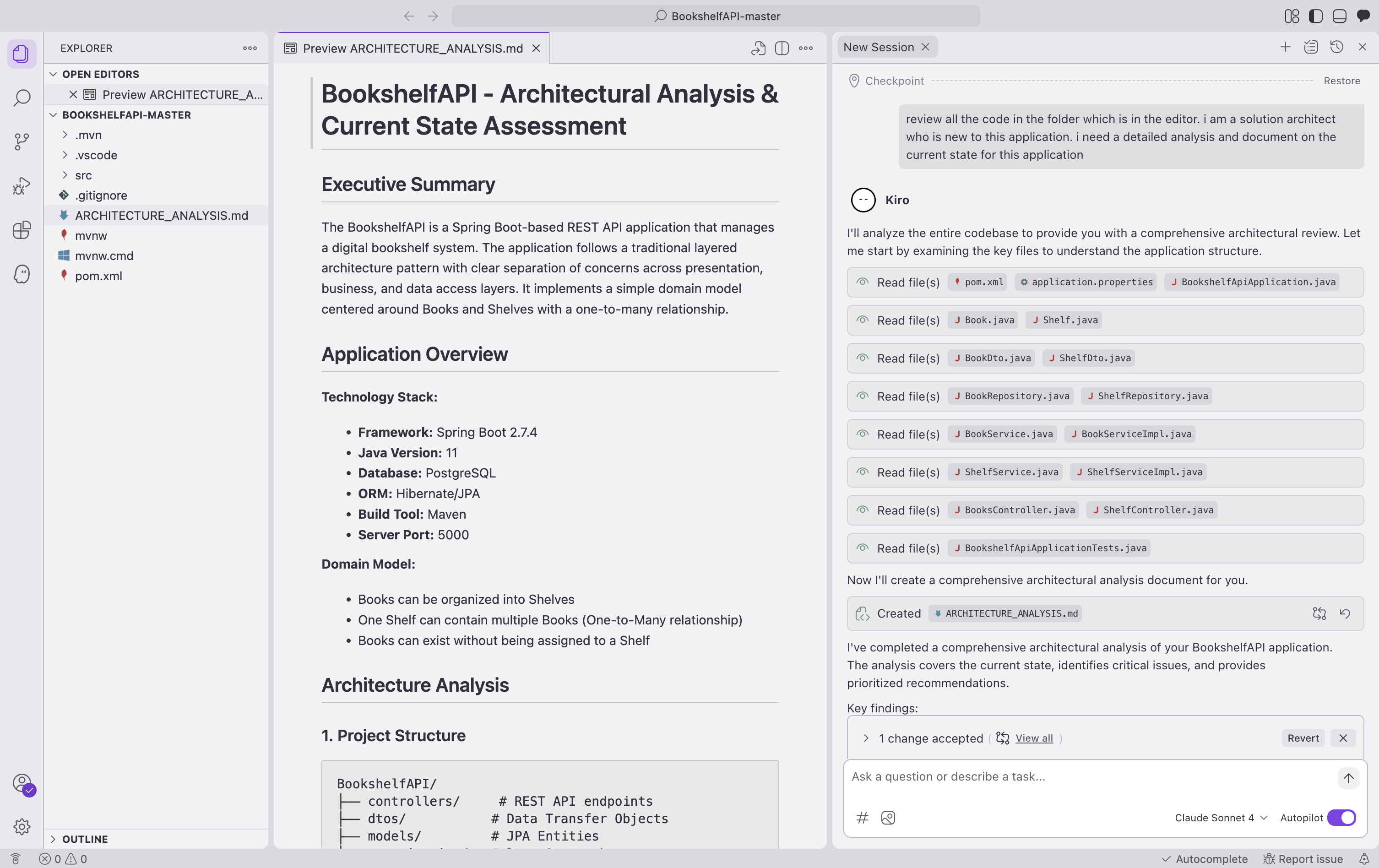 The first phase of agentic architecture modernization focuses on automated analysis of existing systems. Kiro examines codebases to identify architectural patterns, dependencies, and potential modernization opportunities. This analysis generates detailed documentation that would typically require weeks of manual effort from senior architects and developers. This automated analysis approach reduces assessment time from weeks to days while ensuring consistent evaluation criteria across all system components.