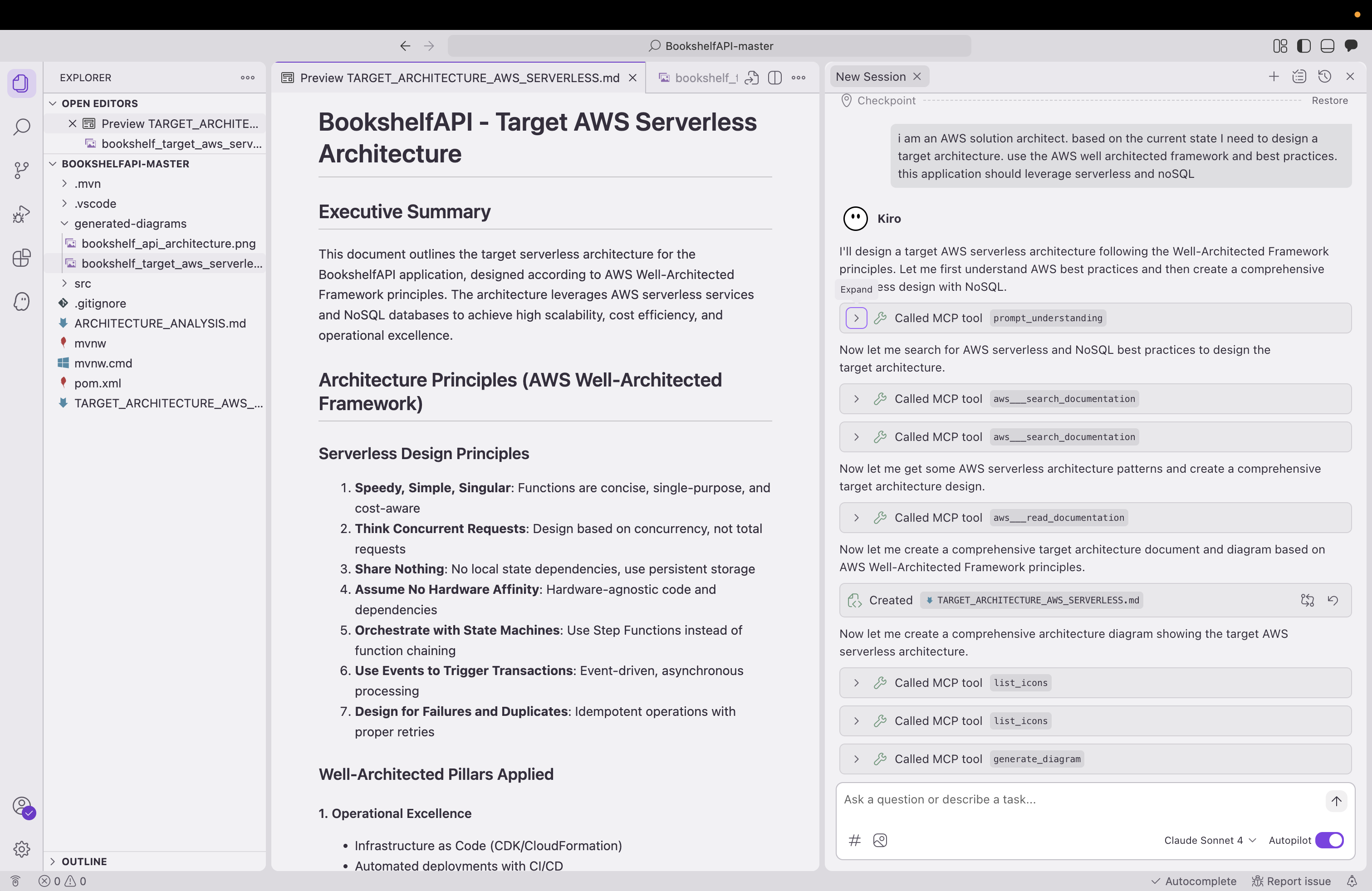 With current state analysis complete, Kiro transitions to designing target AWS architectures optimized for specific organizational requirements. The AI assistant leverages its understanding of AWS services and architectural patterns to recommend solutions that balance performance, cost, and operational complexity. Integration with AWS MCP servers ensures that all recommendations reflect current service capabilities and pricing models.