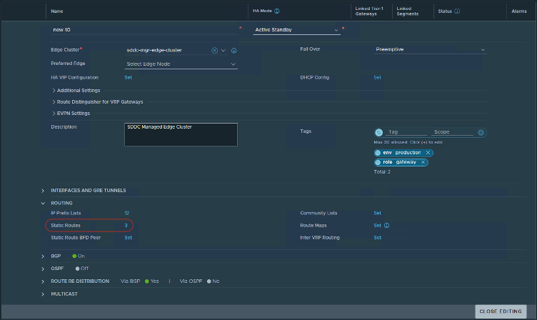 - Navigate to Networking > Tier-0 Gateways and edit the new T-0 Gateway