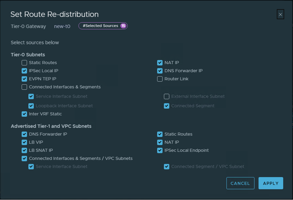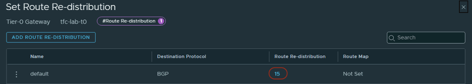 Figure 24: NSX Tier-0 Static Route Re-distribution console