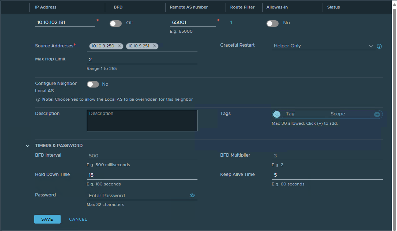 | IP Address | Remote AS Number | Source Addresses | Max Hop Limit | Hold Down Time | Keep Alive Time |