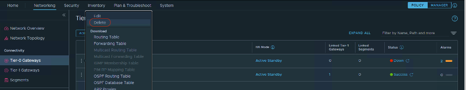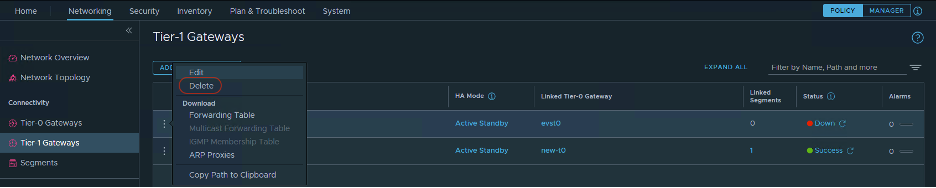 - Navigate to Networking > Tier-1 Gateways and edit the new T-1 Gateway