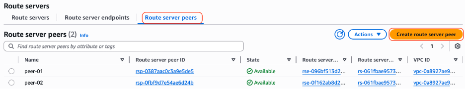 8. Create two new route server peers on the new route server endpoint, by following the steps below.