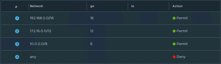 3. Create a prefix list for only allowing RFC-1918 addresses to be advertised by BGP.