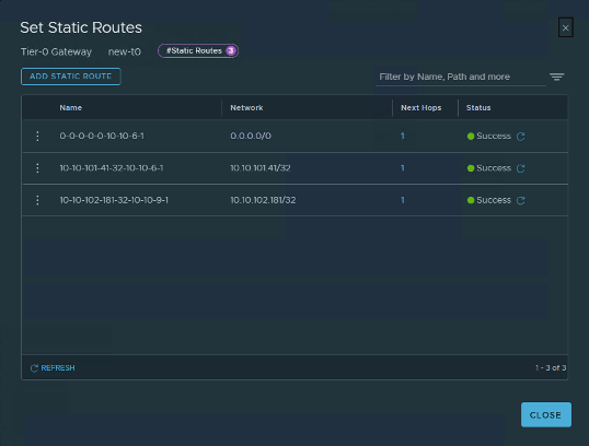 This step tells NSX how to reach the Route Server Endpoint IP addresses, as they are on a different network to the NSX Edge uplink interfaces. The first static route is the default route for all traffic exiting NSX to the VPC Underlay. The second static route points to endpoint-01 on the RouteServer, via the NSXUplink vlan gateway and the third static route points to endpoint-02 on the RouteServer, via the expansionVlan2 vlan gateway.