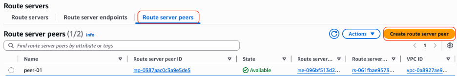 - Now that there is a new Endpoint in our second private subnet, you need to create two route server peers. These peers define the BGP partners of the endpoint, which in this case, will be the new edge nodes that will be created