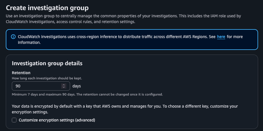 - You can optionally customize the encryption settings. For example: if you would like to use a customer managed key instead of the default one provided by AWS. For more information, see Encryption of investigation data.