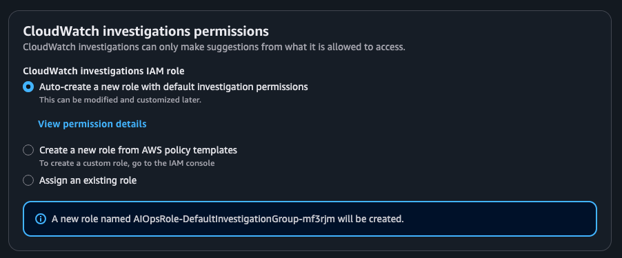- In the “Investigation configuration” section, you can setup the IAM role that CloudWatch investigations will use to access telemetry data for its investigations. Select “Auto-create”. This will create a configure the new role with the required permissions.