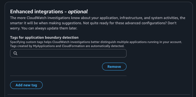 - Tags for application boundary detection: This section allows you to specify existing custom tag keys used for your applications. These tags help CloudWatch investigations refine its search when discovering resource relationships. More information can be found here.