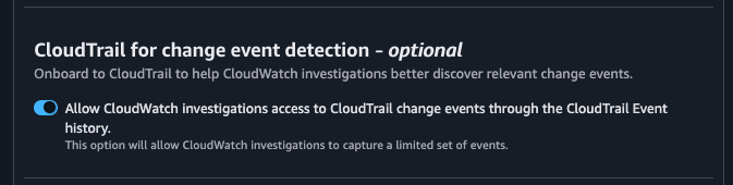 - The CloudTrail section for change event detection lets Amazon CloudWatch investigations access CloudTrail data, improving its analysis of system changes and root cause hypotheses.
