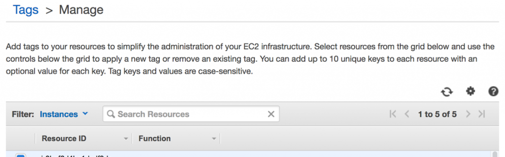 If your instances are not tagged already, you can tag your instances in the EC2 console. Select Tags in the left navigation pane. You can attach a pre-defined tag or add a new tag if need be by choosing Manage Tags.