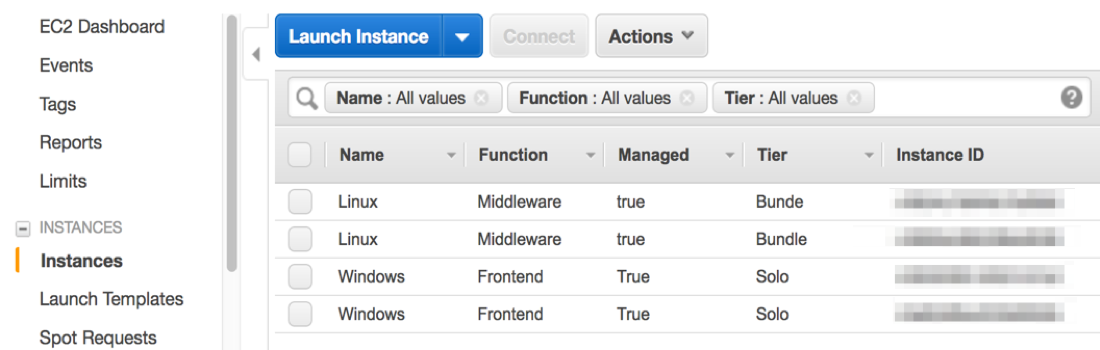 Let’s say we have a collection of managed EC2 instances. The following screenshot shows a list of managed instances in the EC2 console that is filtered by the required tag keys.