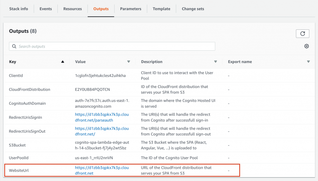 The deployment can take about 20 minutes because it includes a CloudFront distribution that takes a short time to propagate. After deployment, in the resulting CloudFormation stack, navigate to the Outputs tab. In the list, click the value for WebsiteUrl to open the example SPA in your web browser. You’ll be prompted to sign in.
