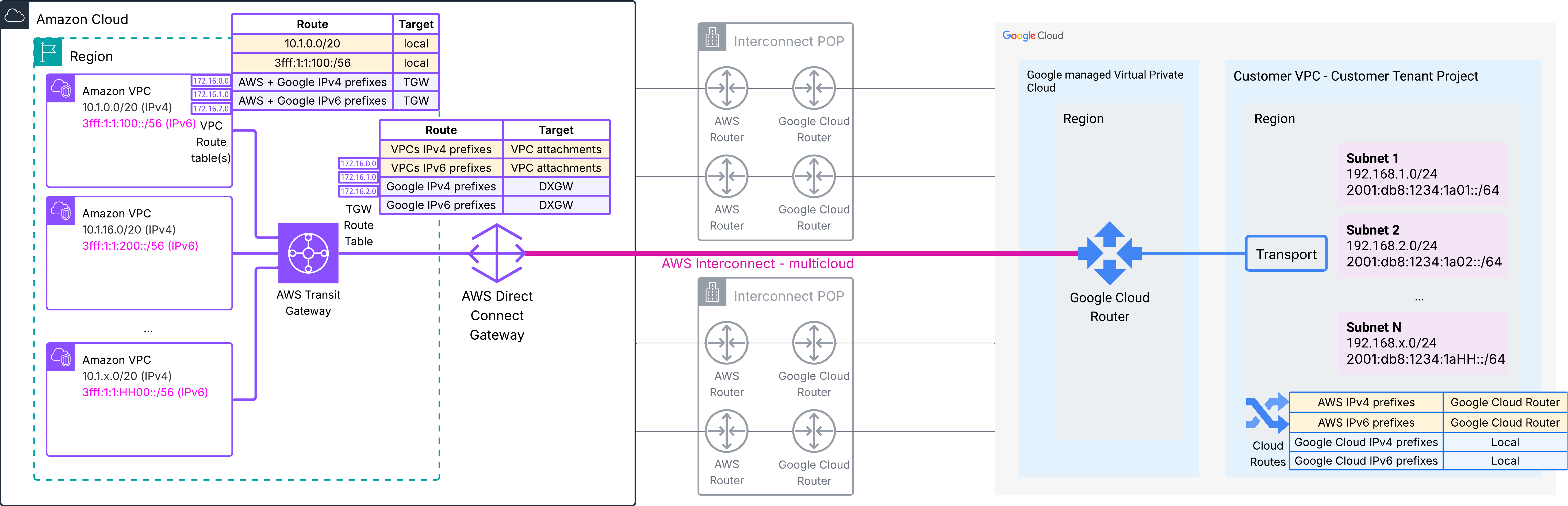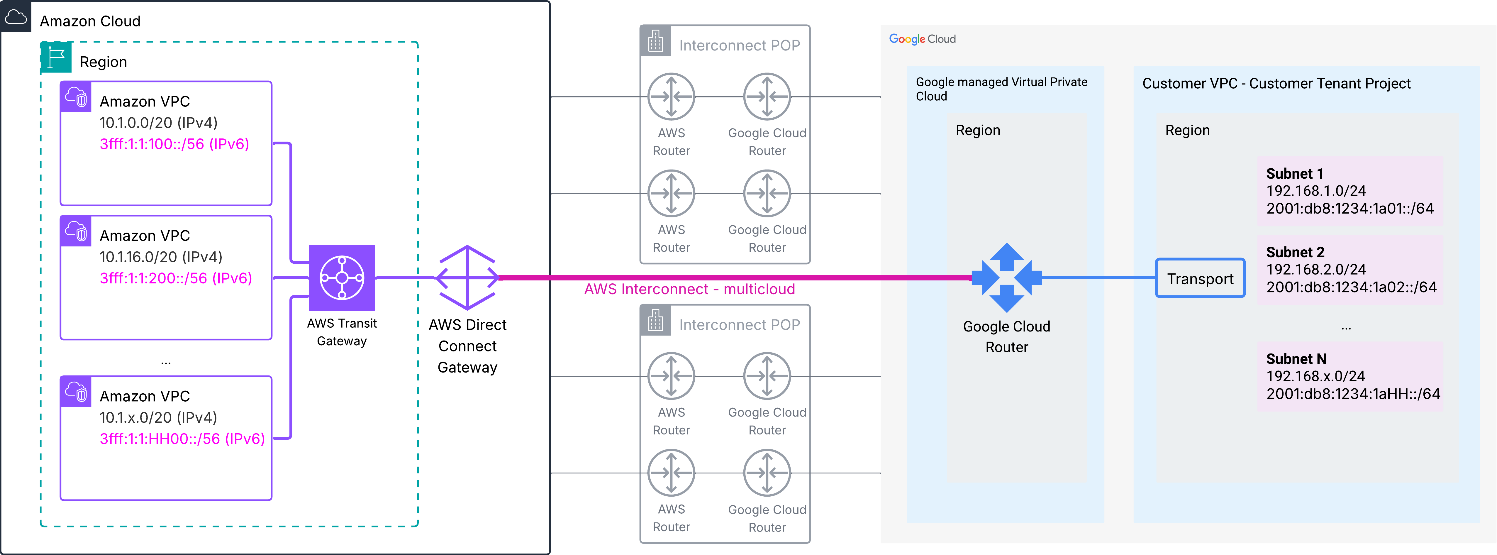 - We recommend you coordinate IP address management meticulously across all AWS Regions and Google Cloud regions to prevent overlapping address spaces as you add more interconnection points and expand your global footprint across multiple routing domains.