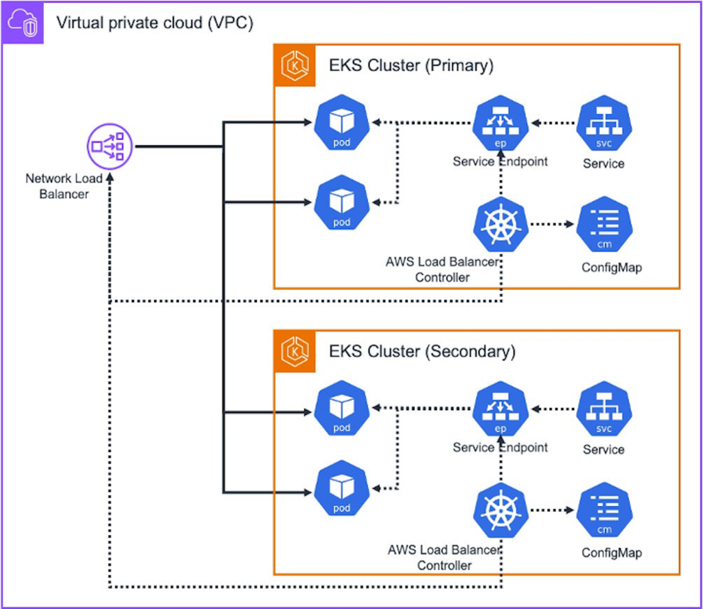 - Managing targets: For each EKS cluster, the LBC maintains a separate ConfigMap that tracks the targets for that cluster’s service endpoints. This makes sure that only the targets specific to a particular cluster are registered or deregistered from the NLB, avoiding any accidental changes to other clusters.