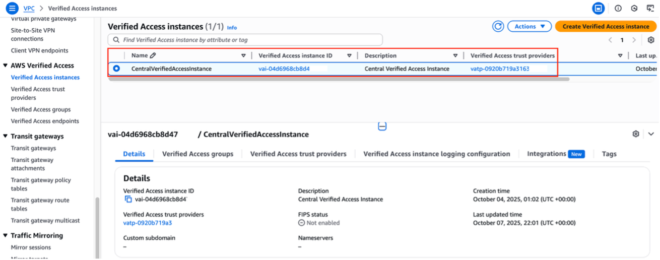 Figure 2: Verified Access instances page showing the deployed instance with the instance ID, creation timestamp, and associated trust providers - Navigate to the Verified Access trust providers tab to verify the configured IAM Identity Center as a User-identity trust provider, as shown in Figure 3.