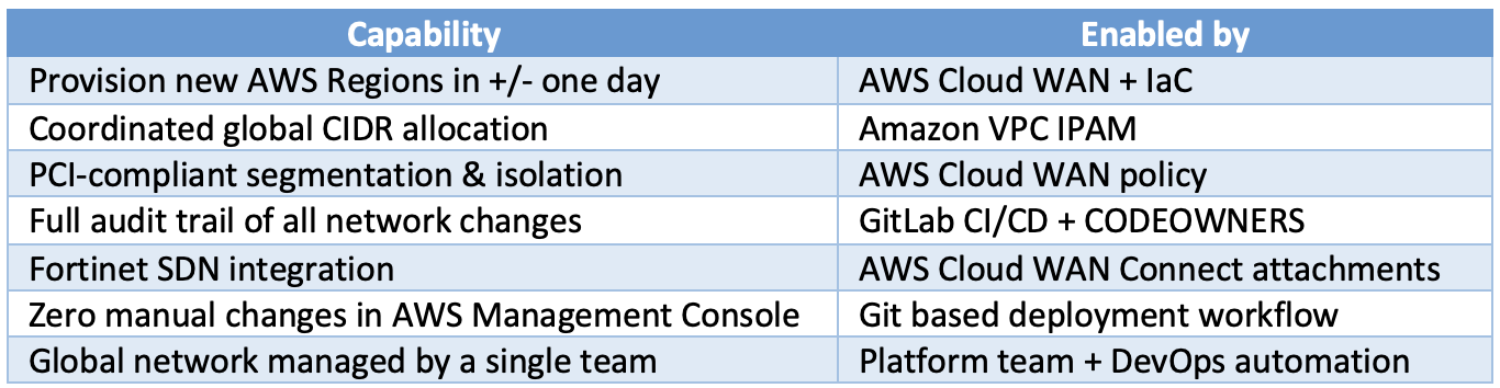 Our original goal was to add support for a second Region. But AWS Cloud WAN, combined with our IaC and CI/CD practices, provided a full network reimplementation. We used it to take the network to the level we imagined: a fully automated, compliant, controlled, auditable network, and with minimal operational overhead. Typically, any enterprise with a global network has a networking team. We manage our global network, together with our base AWS platform, with our Platform team. The level of automation and stability, together with our own DevOps practices, enable this.