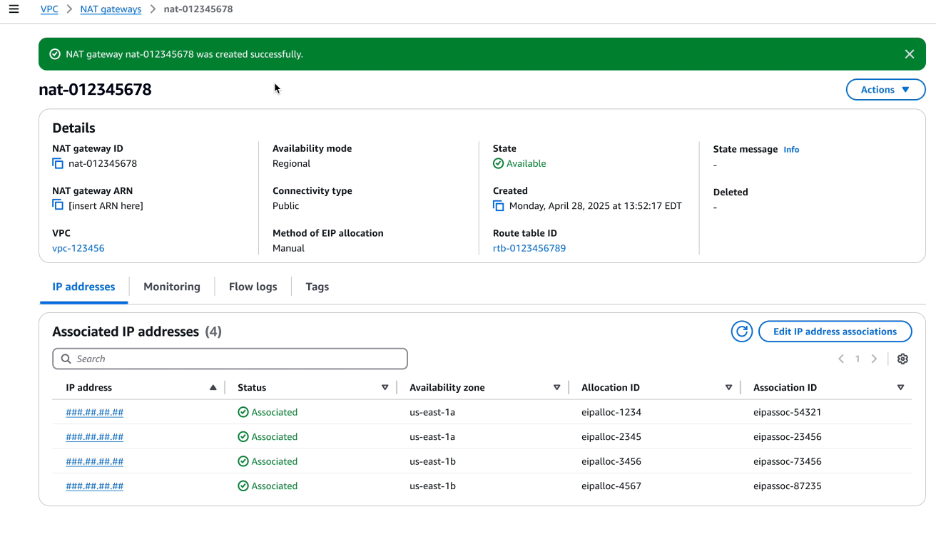 After creation, you can view various details including the NAT Gateway ID, ARN, Availability mode, IP allocation method, Route Table ID, and associated IP addresses:
