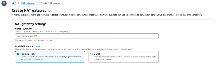Today, AWS announced regional availability mode for NAT Gateways. With this launch, you can create a single NAT Gateway that automatically expands and contracts across availability zones (AZs) in your Virtual Private Cloud (VPC) based on your workload presence, to maintain high availability. You create a Regional NAT Gateway for your VPC, and you do not need public subnets in every availability zone to host your regional NAT Gateway (RNAT). In this post, we walk through how you can leverage this new availability mode on your NAT Gateways.