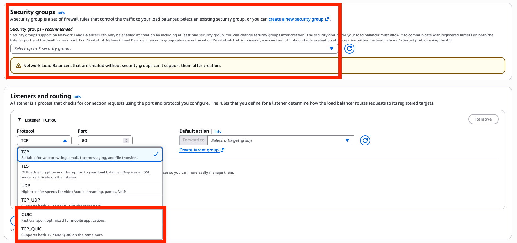 - Click Create under Network Load Balancer. On the next screen, you will see the new QUIC related options available when no security groups are defined, as shown in Figure 1.