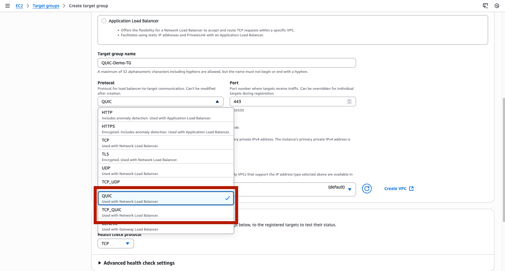 Figure 2: NLB Target Group configuration with new QUIC and TCP_QUIC protocol options highlighted