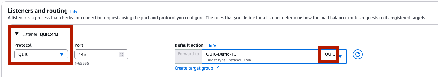 Figure 4: Completed listener configuration, with QUIC protocol and target group highlighted.