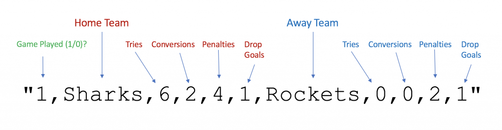 So if the game hasn’t taken place, the first character would be 0 and all the numbers would be 0 as well. The score and league points can be calculated from this information.